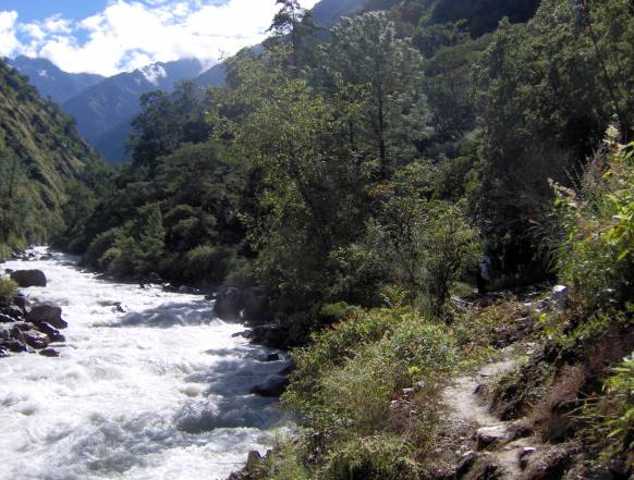 Da stien når over 4.000 meter, er det tydeligt, at landskabet er blevet mere åbent, dalene er brede, og de høje bjerge kommer for alvor til syne, når stien fortsætter gennem alpine elve. Stien snor sig stadig ind og ud af skovområder, men de store, tætte skove fra de lavere egne er nu skiftet ud med skove af primært rodondendron, birk og silkefyr.