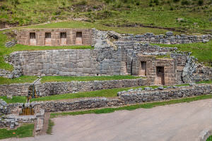 Det spektakulære soltempel er et eksempel på inkafolkets imponerende arkitektur. Langs trappen som er at finde i soltemplet, løber en kanal med vand, som udsluser i 16 rituelle bade. Vandet stammer fra to kilder ved Inkastien.